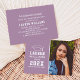 Annoncez votre baccalauréat ou diplômé de l'université en style avec cette faire-part de remise de diplômes et l'invitation de la fête. La carte recto-verso présente un portrait supérieur du diplômé avec un casquette de grade et un design simple et moderne de typographie blanche. Lavande / violet violet arrière - plan peut être changé en une couleur différente avec la fonction "Personnaliser It", puis Modifier / Arrière - plan pour sélectionner une autre couleur.
