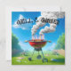 Gril rouge grillant des hot-dogs avec beaucoup de fumée sur une pelouse verte pour le 4 juillet.