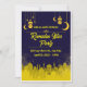 Une invitation royale bleu foncé et jaune à un dîner de fête Iftar avec un quartier de lune et des lanternes suspendues. La carte est facile à personnaliser avec votre libellé, police, couleur de police, options de forme de papier et choix de types de papier.