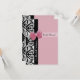 Un style portrait 3,5" x 5", élégante invitation à la parisienne rose et noir, avec un damas noir et blanc branché et un ruban rose chic enveloppé d'un arrière - plan de dentelle rose féminin. Personnalisez pour invitation vos invités à assister.