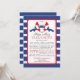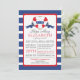 Invitation à la douche nuptiale moderne rouge, blanc et bleu. Notre invitation contemporaine Ships Ahoy à la douche nuptiale comporte un coeur rayé rouge et blanc Buoy avec une bannière bleue avec les initiales des couples dessus. Le arrière - plan est une bande horizontale bleue et blanche et brillante. Retourner l'invitation pour obtenir une bande correspondante. Visitez notre boutique pour voir cette invitation amusante de douches nuptiales avec un arrière - plan rayé rouge audacieux pour une douche nuptiale d'été sur la plage.