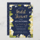 Cette invitation à la douche nuptiale moderne et jolie comporte une bordure florale illustrée et les mots "Fête de l'mariée" en or (feuille simulée). Le arrière - plan est bleu marine, mais peut être customisé à n'importe quelle couleur. L'arrière du invitation comprend un motif de feuille de papier carré en or (feuille simulée) avec un arrière - plan bleu correspondant qui peut également être échangé. Le texte est personnalisable pour votre événement spécial de célébration pré-mariage.