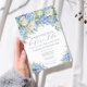 Conception de fête de mariage élégante et féminine "quelque chose de bleu avant de faire" avec des arrangements floraux peints à l'aquarelle de fleurs d'hortensias bleus, de verdure et de roses blanches.