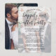 Invitez votre famille et vos amis à une célébration de mariage simplement élégante et sans cérémonie avec cette invitation moderne et stylée avec superposition de 2 photos. Tout le texte est simple à personnaliser pour une cérémonie de renouvellement de vœux, un deuxième mariage, un 1er anniversaire, ou une soirée de mariage après une fugue ou un dîner. Personnalisez-la pour inclure tous les détails de votre choix, tels que la date du mariage, le code vestimentaire, la réponse, le site web, etc. (ASTUCE DE PLACEMENT D'IMAGE : Un moyen facile de centrer une photo exactement comme vous le souhaitez est de la rogner avant de la télécharger sur le site Web de Zazzle.) Le design moderne minimaliste noir et blanc présente deux photos du couple de jeunes mariés, une calligraphie script manuscrite tendance et une typographie élégante de style machine à écrire. Que vous ayez fait une fugue, organisé une minimonie ou un micro-mariage plus intime, ou que votre célébr