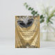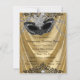 Jolie invitation à la mascarade en noir et or avec un beau masque en plumes de mascarade noire, perles avec tourbillons noirs sur un élégant arrière - plan en satin or. Vous pouvez facilement customiser cette belle invitation de fête mascarade en noir et or pour votre événement en ajoutant vos détails dans le style de police et de couleur, et le libellé de votre choix.