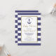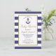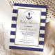 Cette invitation de baby shower nautique comporte une ancre bleu marine dans un rectangle à bordure dorée sur un fond de rayures bleues marine et blanches. À l'intérieur du rectangle, les mots "Baby Shower", le nom de la future maman et la date limite de réponse apparaissent en écriture manuscrite de couleur dorée. Le texte restant est en bleu marine. Idéal pour un baby shower de garçon. Le texte est entièrement personnalisable. Besoin d'articles assortis pour votre baby shower sur le thème nautique ? Consultez notre collection pour des fournitures de fête et des décorations supplémentaires dans ce design.