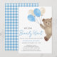 Cette charmante invitation à la fête de naissance de bébé garçon présente un ours en peluche aquarelle adorable avec des ballons bleus et beige. Le dos a un motif à carreaux gingham bleu. Il est écrit "Nous pouvons à peine attendre" en calligraphie script stylée. Il est facilement personnalisable. Aquarelle originale © Michele Davies.