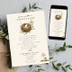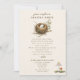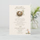 La page d'un livre d'histoire de la nature a inspiré l'invitation de baby shower de la fête de nidification avec l'illustration d'un nid d'oiseau avec un oeuf moucheté blanc. Design de champignons en bas à droite.