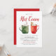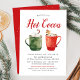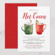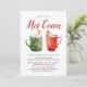 Cartes d'invitation de fête de fin d'année mignonnes avec des tasses vertes et rouges aquarelles pleines de chocolat chaud avec des cannes à bonbon, des guimauves et un biscuit au gingembre. Personnalisez les invitations de fête de cacao chaud avec vos détails de fête et une liste de garnitures de chocolat chaud.