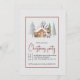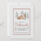 Ours et arbres d'hiver Joyeuses fêtes de Noël Invitation qui présente un raton laveur en vêtements d'hiver, une maison et des chutes de neige.
