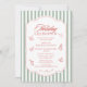 Fête Fête Fête de Noël Entreprise Fête de Noël Invitations présentent des éléments de Noël rouge vif sur un arrière - plan rayé vert et blanc avec le texte "Fête de Fête" dans élégante typographie de script de calligraphie rouge. Elégant, tendance et chic pour votre fête de vacances d'entreprise. Créé par Evco Studio www.zazzle.com/store/evcostudio