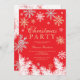 Une parties scintillant d'or de Noël de Noël moderne, des flocons de neige argentés et blancs illustration sur un arrière - plan rouge modifiable, toutes les illustrations couleur sont modifiables pour correspondre à votre propre palette de couleurs avec des branches de pin blanc sur arrière - plan bleu marine avec une élégante typographie de script.
