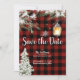 Snowy Plaid Christmas Holiday Party Save the Date Invitation - Un design chaleureux et cosy avec des boughs enneigés de pinèdes naturelles, cônes de pin, branches et flocons de neige, avec une lampe-coach brillante sur un arrière - plan chaud de buffle rouge, cette invitation comprend "Save the Date" et d'autres textes en calligraphie joyeuse lettrée à la main, avec le reste de l'invitation dans une belle sans serif de la graphie. L'invitation de rappel parfaite pour votre événement à venir, afin que vos invités aient la journée libre. Copyright Anastasia Surridge Designs, tous droits réservés.