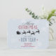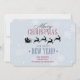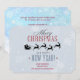 Une invitation festive à une fête de Noël. Un fond gris bleuâtre subtil avec des flocons de neige. Lettres fantaisistes et tendance qui disent : Joyeux Noël et Bonne Année. Avec la silhouette noire de Santa voyageant dans son traîneau tiré par ses rennes volant dans le ciel.