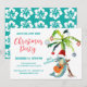 Une invitation à la fête de Noël tropicale et mignonne présente un dauphin jouant de la guitare dans un chapeau de Père Noël appuyé sur un palmier décoré d'ornements festifs, chantant la chanson de Noël hawaïenne "Mele Kalikimaka". Le côté inverse est bleu aqua avec des fleurs d'hibiscus blancs. Personnalisez avec les détails de votre événement. Oeuvre originale KL Stock.