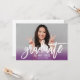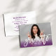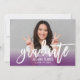 Célébrez votre diplômé avec une invitation de fête de remise de diplôme moderne comportant une photo plein cadre, un « diplômé » écriture pinceau blanc gras et un dégradé de couleur violet frais. Une personnalisation propre et minimale met en valeur le nom et l'année de promotion sans surcharge. Le verso comprend une mise en page blanche coordonnée avec un texte de titre violet assorti pour les détails de votre fête. Facile à personnaliser.