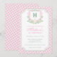 PreppyPrint.com - Célébrez le grand événement de votre petit avec cette invitation de premier anniversaire avec monogramme en forme de blason à l'aquarelle. Des détails de blason nets se rencontrent avec des lavis d'aquarelle rose tendre pour un look qui semble tout droit sorti d'une fête de jardin classique. Veuillez visiter ma boutique de design, PreppyPrint.com, pour des articles coordonnés.