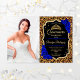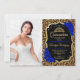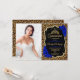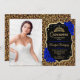 Invitation de fête de Quinceanera avec votre photo. Caractéristiques d'impression de léopard guépard, police de caractères script, roses bleues royales, couronne et confettis. Conception élégante de saphir noir et blanc avec faux or brillant. Parfait pour une célébration élégante.