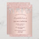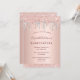 Une invitation moderne, élégante et glamour pour une Quinceañera, fête d'anniversaire des 15 ans. Un fond métallisé rose gold avec un effet de gouttes de peinture rose gold élégant, rose et argent pailleté. Le nom est écrit avec un style de lettrage à la main de couleur rose gold foncé moderne. Personnalisez et ajoutez un nom, un âge et les détails de votre fête.