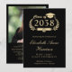 Invitation à une fête de remise de diplômes universitaire noire élégante avec l'année de promotion du diplômé dans un blason de couronne de laurier avec un chapeau de diplômé et un diplôme, leur nom dans une écriture formelle, et leur école, spécialité, distinctions ou projets futurs dans une typographie serif classique. Au verso, ajoutez une photo et les détails de la fête de remise de diplômes.