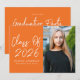 Cartes d'invitation à une fête de remise de diplômes moderne avec "Promotion 2023" en écriture manuscrite blanche sur fond orange. Personnalisez le recto de l'invitation en ajoutant le nom du diplômé, le nom de l'école et une photo verticale. L'invitation se retourne pour afficher les détails de la fête de remise de diplômes en lettrage blanc sur fond orange.