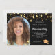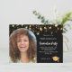 Ajoutez votre propre photo verticale du diplômé. Un cadre photo en arc. Une couleur arrière - plan noire classique, décorée de faux étoiles dorées. Personnalisez et ajoutez un nom et des détails du parti.