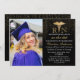 Cartons d'invitation élégants pour la fête de remise des diplômes d'infirmière avec un fond noir stylé, une photo du diplômé, des paillettes dorées scintillantes, le symbole du caducée et un modèle de texte moderne facile à personnaliser.