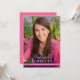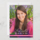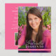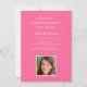 Invitation élégante pour une fête de remise de diplôme avec une photo pleine page à l'avant, avec un prénom en écriture manuscrite moderne et un nom de famille en typographie classique. Personnalisez le nom, l'école et l'année de promotion. Le verso comprend un design rose coordonné avec les détails de la fête, la réponse et les lignes d'adresse pour un look net et soigné.