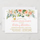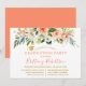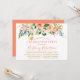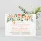 Carte d'invitation à la remise des diplômes élégante moderne avec des roses corail pêche, des fleurs blanches et des feuilles de verdure botanique. Écriture calligraphique tendance. Casquette de diplômé or.