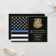Cette conception présente un drapeau de la force de police avec des bandes noires et blanches, ainsi qu'une fine bande bleue. Le badge de police et le texte doré se trouvent au-dessus de tous les détails de la fête pour la fête de retraite de l'agent de police, du shérif, du capitaine ou du chef qui part à la retraite.