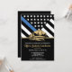 Cette conception présente un drapeau de la police avec des bandes noires et blanches, ainsi qu'une fine bande bleue. Le chapeau de policier et le texte doré se trouvent au-dessus de tous les détails de la fête pour la retraite de l'agent de la force publique, du shérif, du capitaine ou du chef en retraite.