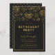 Carton d'invitation de fête de retraite à motif floral élégant avec motif floral et bordure en faux doré sur fond gris foncé au recto. L'invitation présente un motif à pois en faux doré sur fond gris foncé au verso.
