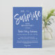 Créez une invitation de fête surprise personnalisée. Cette invitation de fête comporte une écriture calligraphique spacieuse et magnifique avec un fond bleu outremer. Vous pouvez facilement la personnaliser avec votre propre texte et la modifier à votre goût. Veuillez noter : "Chut..." et "Surprise" ne peuvent pas être modifiés.