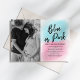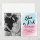 Invitez famille et amis à votre fête de révélation du sexe du bébé. Ces invitations élégantes pour la fête de bébé du couple présentent une photo des futurs parents, une explosion de poudre rose et bleue, la phrase adorable "bleu ou rose, qu'en pensez-vous?", ainsi qu'un modèle de fête de révélation du sexe facile à personnaliser.