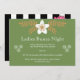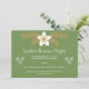 Invitation moderne de soirée Bunco pour dames à fleurs vertes, dorées et blanches. L'invitation parfaite à envoyer aux joueurs pendant le mois de décembre pour les inviter à un échange de cadeaux de vacances. Achetez des exemplaires imprimés ou numériques. Nous vous souhaitons beaucoup de Bunco.