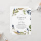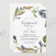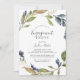 Cette invitation à la fête de fiançailles verdoyantes d'automne est parfaite pour un événement fiançailles d'automne. Le design rustique moderne présente des feuilles bleu marine, vert sauge et or avec des branches de fleurs bleu foncé.