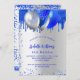Une invitation à la fête d'anniversaire du 18e (ou de tout âge). Devant : Un faux arrière - plan argenté. Décoré avec des gouttes de parties scintillant bleu royal, la peinture goutte à goutte et les ballons. Personnalisez et ajoutez un nom et des détails du parti. Le nom est écrit avec un script de style écrit à la main.