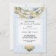 Ce joli design présente des couronnes de branches bleu marine et des feuilles avec de petites fleurs d'or, un motif de points bleu aquarelle, et, à l'envers, un motif de menorah doré et l'Étoile de David. La typographie élégante est une combinaison de script moderne et de bloc moderne. La couleur arrière - plan bleu pastel peut être modifiée en choisissant l'option personnaliser. #Hanoukka #Invitations #Vacances