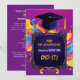 L'invitation éclate d'une émeute de couleurs vives, allant des violets et des roses joyeux aux jaunes ensoleillés et aux bleus éclatants. En haut de la page se trouve un casquette en carton bleu foncé, ajoutant une touche de charme érudit au milieu du chaos coloré. La légende donne le ton d'une fête animée, invitant les invités à se joindre aux festivités avec une touche d'humour et de camaraderie. Au dos, contre un arrière - plan violet audacieux, le texte de l'invitation attend. Les détails essentiels de l'événement sont présentés dans un texte ludique et coloré, assurant que les clients sont bien informés tout en maintenant l'esthétique ludique et dynamique de l'invitation. Dans l'ensemble, cette invitation promet une célébration remplie de rire, de joie et de souvenirs inoubliables, capturant parfaitement l'esprit de l'occasion dans toute sa gloire colorée.