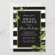 Une invitation audacieuse et élégante à la douche nuptiale avec rayures noires et blanches bordées de verdure luxuriante et de confettis de parties scintillant.