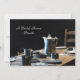 Ma photographie originale d'un cadre de table d'ouest, avec des tasses en étain, un pichet en argent et une table en planches de bois, décore l'avant de cette élégante invitation à deux côtés de Brunch Fête des mariées à l'ancienne. L'envers est recouvert de lettrage noir sur un arrière - plan de couleur lin pâle. Très classe ! Vous pouvez facilement personnaliser le nom, le titre de l'événement, la date, l'emplacement, etc. Photo originale de Marcia Socolik. Tous droits réservés © 2014 Alan & Marcia Socolik.