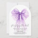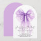 Jolie invitation à la douche nuptiale en forme d'arc avec une belle couleur d'arc-en-ciel en coquette violet, "elle attache le noeud" dans un script chic, et le nom de la mariée et les détails de l'événement en lettres modernes simples.