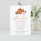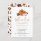 Cette invitation à la douche nuptiale citrouille Fall In Love, mignonne et élégante, présente de belles citrouilles d'orange et de blanc brûlés à l'aquarelle et des fleurs d'automne avec un motif floral assorti sur le dos.