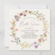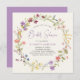 Une élégante invitation à la douche nuptiale crème légère avec "Fête des mariées" présentée dans un script chic violet, et une couronne d'aquarelles fleurs sauvages violet, rose, pêche et jaune. Personnalisez le nom et les détails de la douche de la mariée en lettres simples violettes et grises.