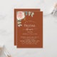 Arrière - plan orange brûlé. Décoré d'or rose et de fleurs roses rousses, de fleurs roses et de feuilles d'eucalyptus vert aquarellés, de sprigs, de verdure et d'une fausse feuille d'or. Personnalisez et ajoutez le nom de la mariée à être et les détails du parti.