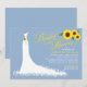 Élégante invitation à la douche nuptiale pour les futurs mariés élégants dispose d'une police de script de calligraphie ornée et d'une robe mariage fluide avec détail de tournesol. Couleurs design blanc, bleu poussiéreux, vert, jaune et marron.