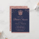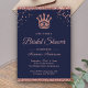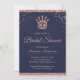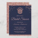 Invitation vos invités avec cette élégante invitation à la douche nuptiale avec une belle couronne d'or rose et typographie moderne sur un arrière - plan bleu. Ajoutez simplement les détails de votre événement sur ce modèle facile à utiliser pour en faire une invitation unique. Retournez la carte pour révéler une texture de parties scintillant d'or faux rose au dos de la carte.