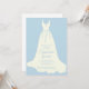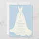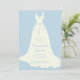 Une belle robe mariage est la caractéristique principale de cette invitation à la douche nuptiale. La robe de couleur ivoire présente des détails floraux et est posée sur un arrière - plan bleu clair.