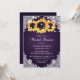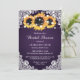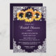 Complétez votre mariage violet rustique avec ces élégantes invitations à la douche nuptiale à fleurs violettes avec des tournesols sur un arrière - plan violet orné de lampes à cordes et de dentelle fleurie blanche. Éléments correspondants disponibles.