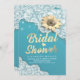 Modèle d'invitations de douche nuptiale - Fleurs de soleil élégantes, cadre Vintage en dentelle et lumières à cordes chic sur Turquoise/ Turquoise/ Arrière - plan bleu Tiffany. Un Design Parfait Pour Votre Grand Jour ! Tous Les Style De Texte, Couleurs, Tailles Peuvent Être Modifiés En Fonction De Vos Besoins.